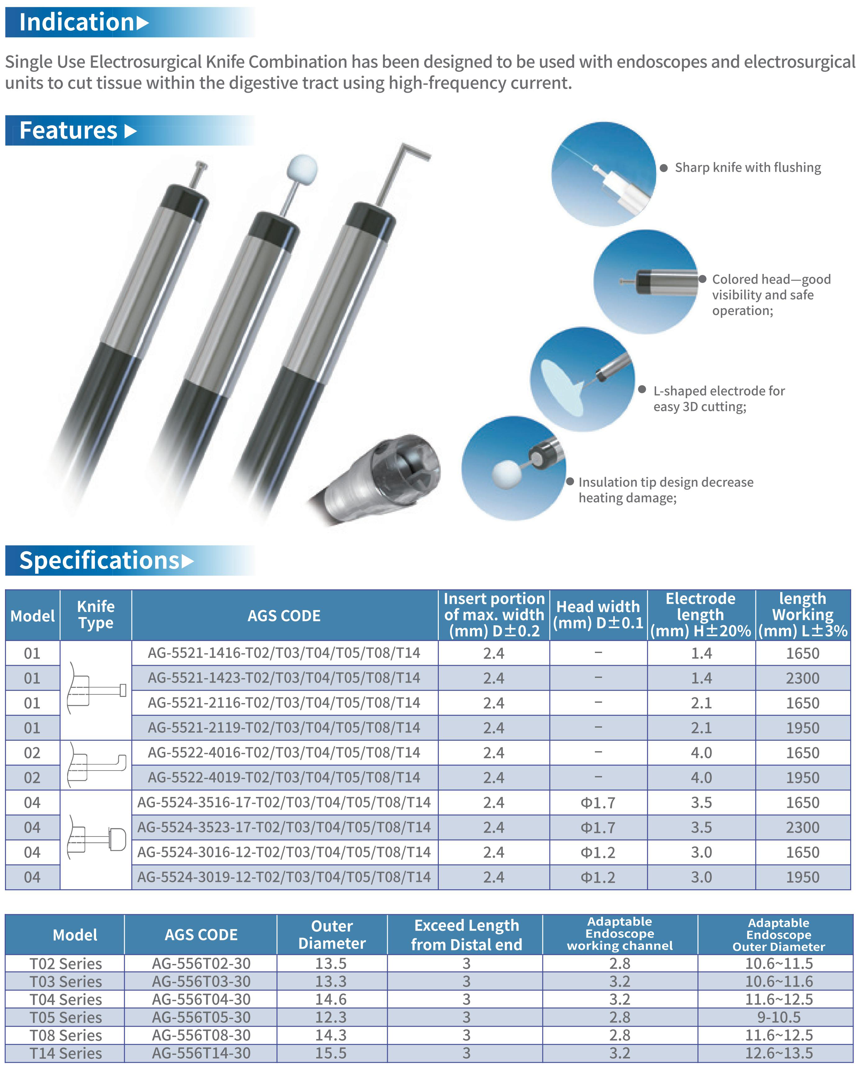 Indication:Single Use Electrosurgical Knife Combination has been designed to be used with endoscopes and electrosurgical units to cut tissue within the digestive tract using high-frequency current.