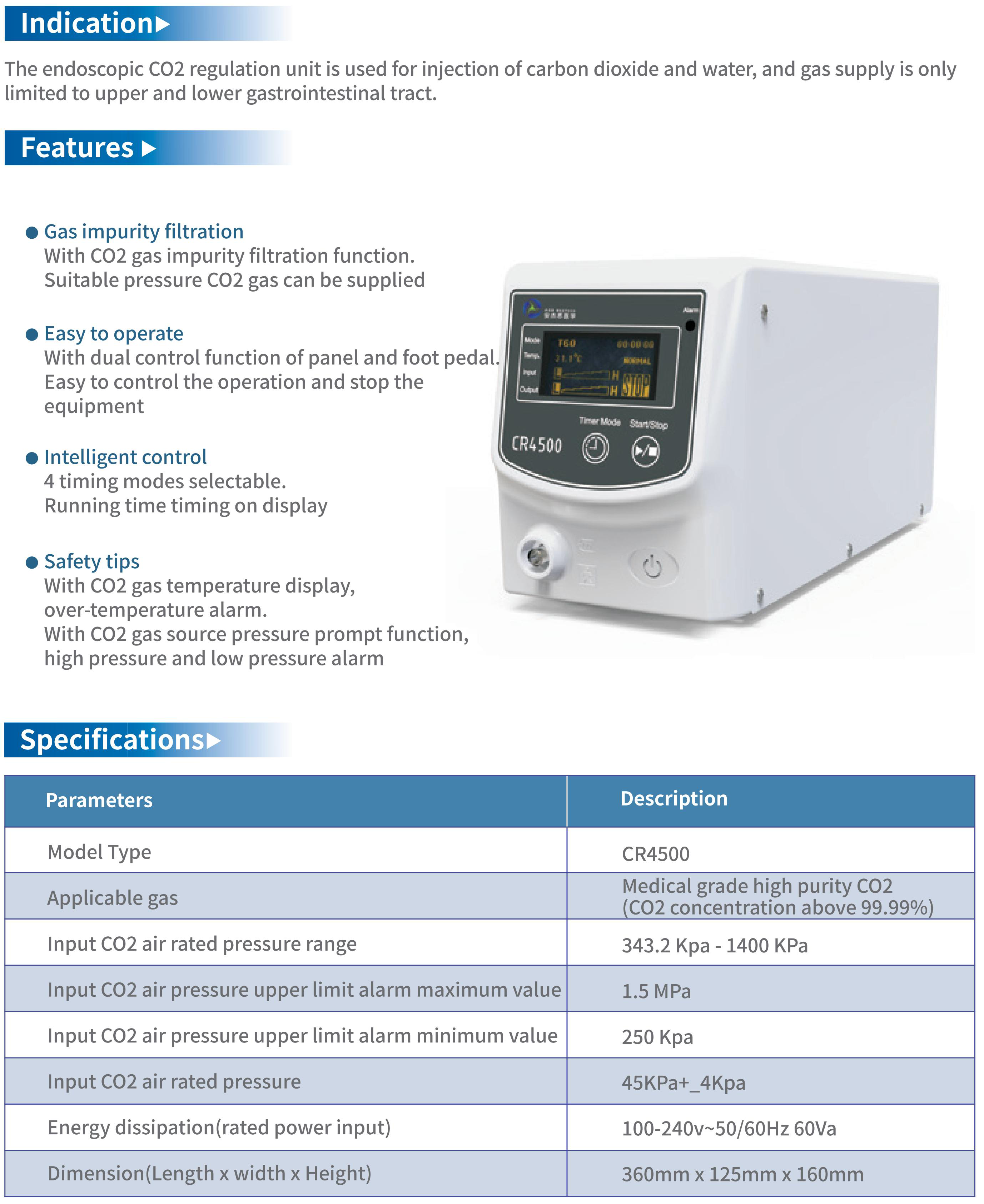 Indication:The endoscopic C02 regulation unit is used for injection of carbon dioxide and water, and gas supply is only limited to upper and lower gastrointestinal tract.